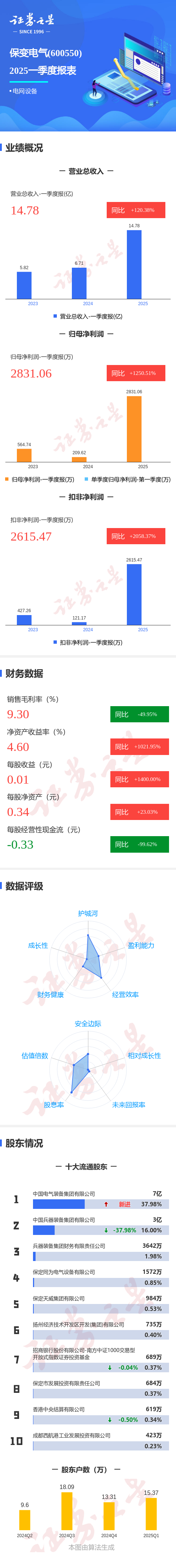 证券之星消息,保变电气2025年一季报显示,公司主营收入14.79亿元,同比上升120.38%;归母净利润2831.07万元,同比上升1250.51%;扣非净利润2615.48万元,同比上升2058.37%;负债率89.74%,投资收益197.3万元,财务费用1607.81万元,毛利率9.3%。